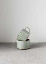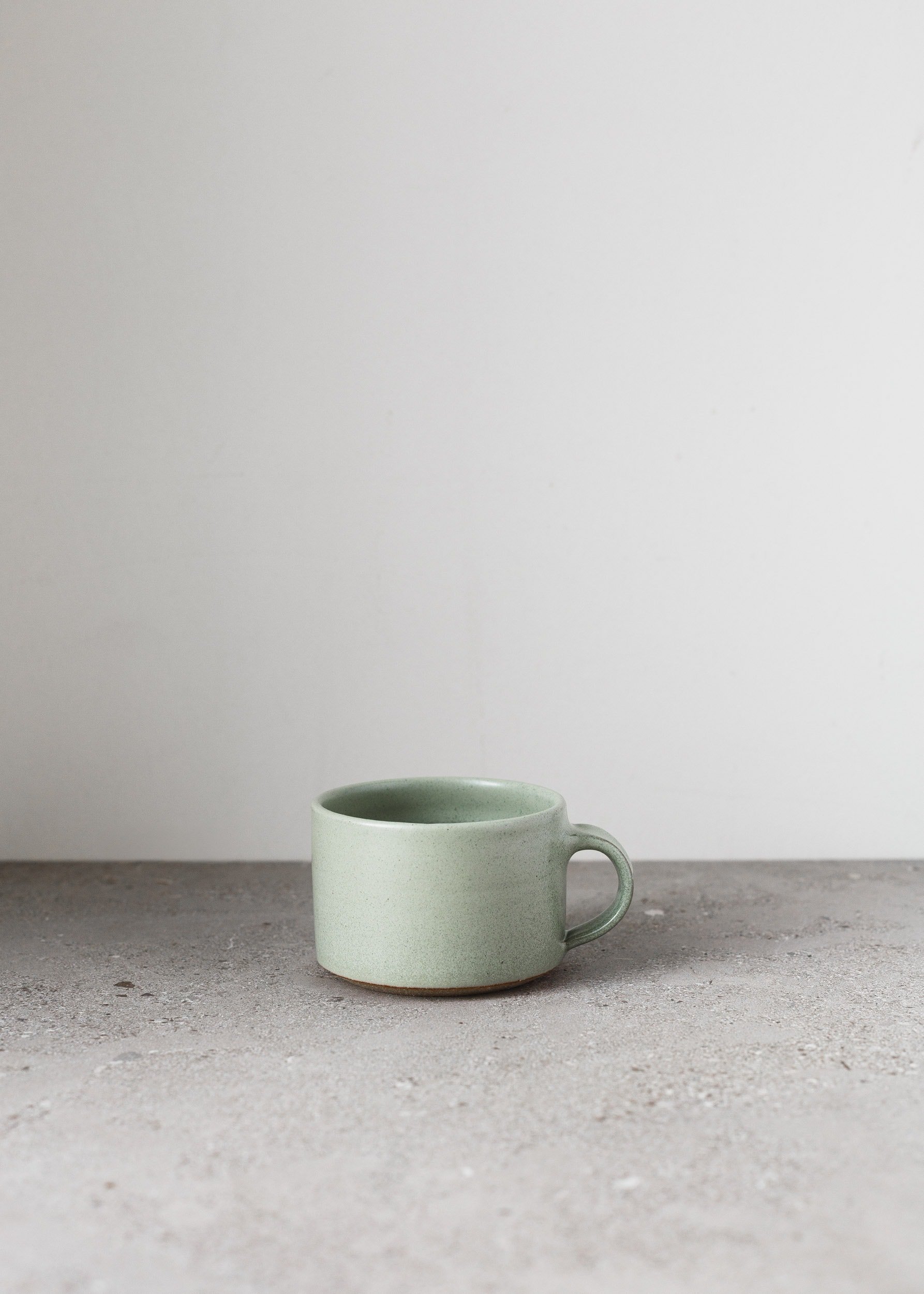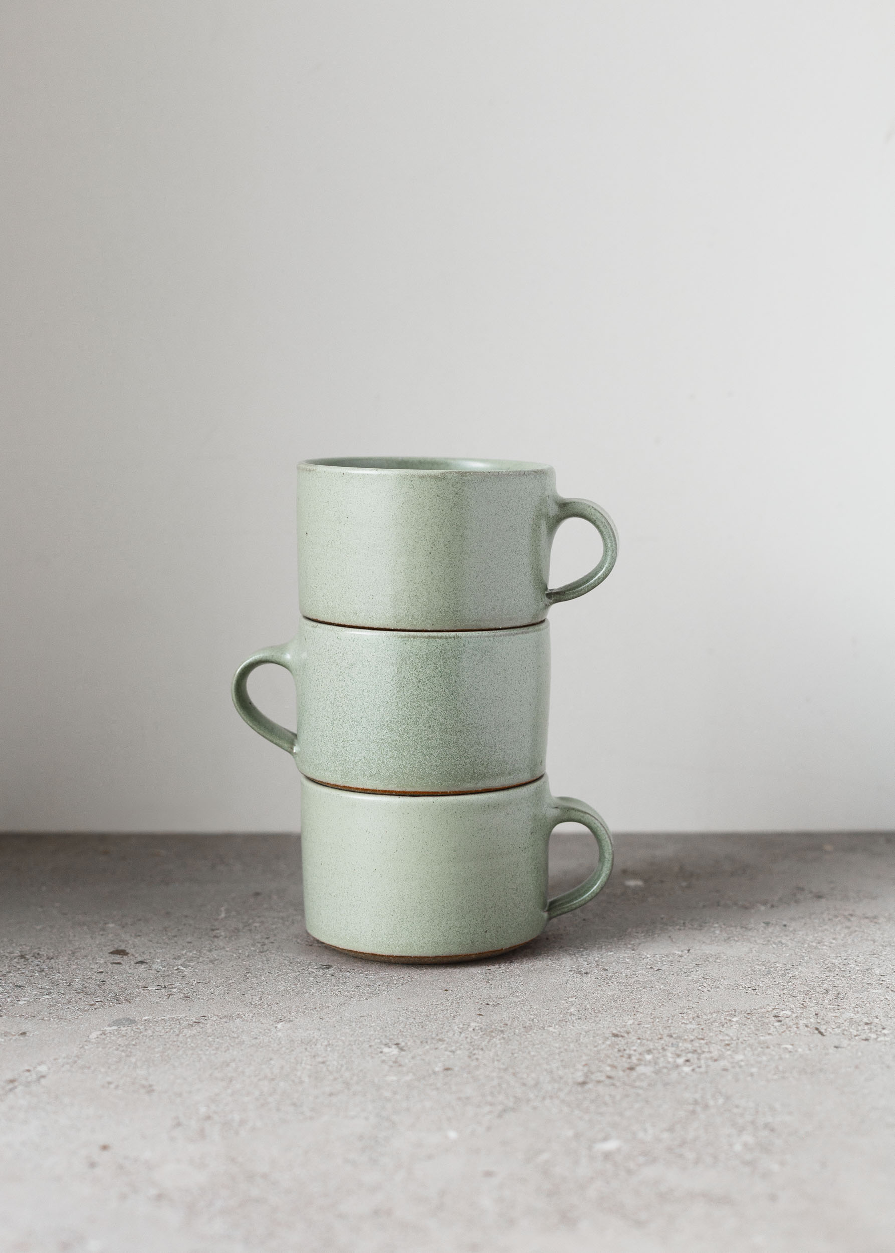 Made using stoneware clay and glaze with a soft light green satin that feels smooth like a pebble.